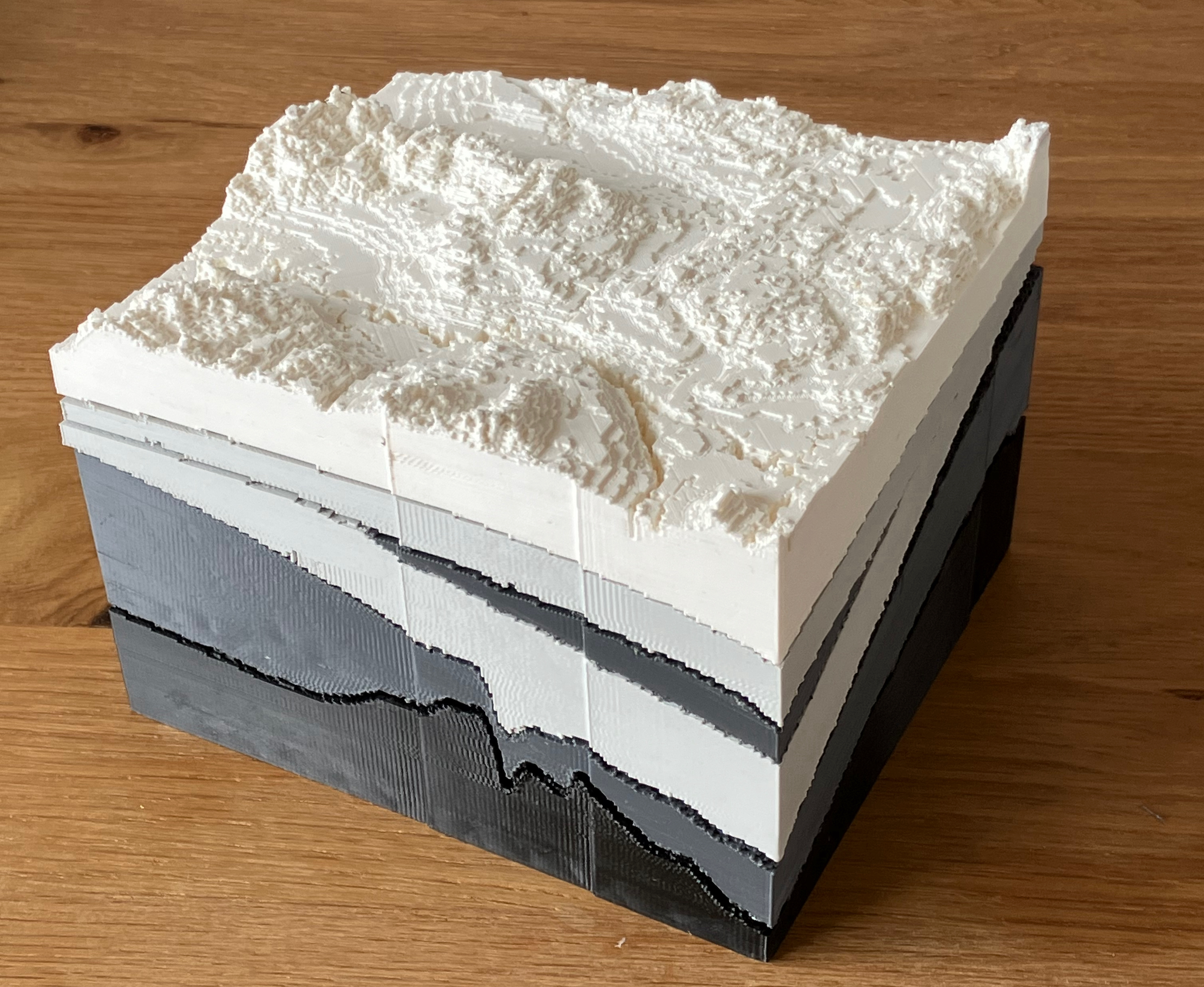 The AGS also provides data for printing your own versions of Alberta’s geology so I also made a 3-D print of the minecraft model of Alberta’s geology, pictured below. I suppose it is also worth noting that I had no idea there was a movie being made about Minecraft when I wrote this, and that when I approached the project it was not about what playing Minecraft in this context was like. I was interested in the data because virtually all of Alberta’s core samples and data is an outcome of extraction.